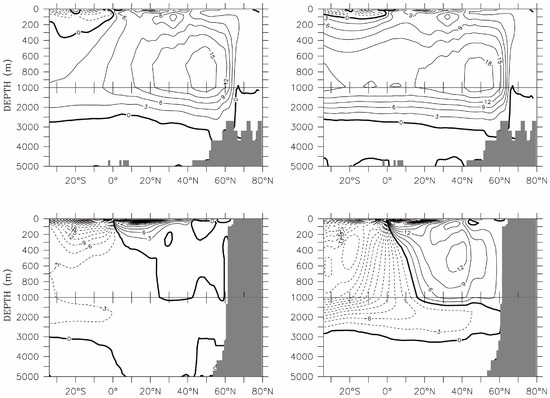 Average streamfunctions (Sv) from Equation (10) in the Atlantic (upper) and in the Indo-Pacific (lower); OTEC is active in the Atlantic only (left), or in the Indo-Pacific only (right).