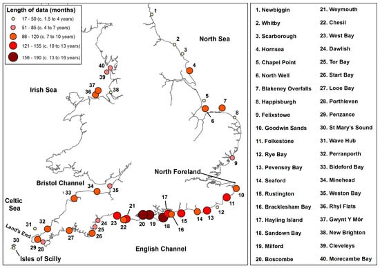 The analysis in this paper is based on the wave data from a network of coastal wave buoys around the English coast deployed by the National Network of Regional Coastal Monitoring Programmes of England (Figure 1). Their coastal wave network concentrates on measurements in shallow water (typically 10 m above Chart Datum) where, traditionally, there were few long-term datasets available. The aims of the network include the generation of characteristic nearshore wave climates for the design of coastal defenses, evaluation of the performance of existing beach management schemes, and validation of numerical wave transformation models []. To date, the coastal wave network comprises 37 directional Waverider buoys (www.channelcoast.org, Southampton, UK). RWE Innogy UK Ltd. (www.rwe.com, Dolgarrog, UK) and Wave Hub Ltd. (www.wavehub.co.uk, Hayle, UK) also make available real-time and archived data from their wave buoys off north Wales and Cornwall, respectively. Record length exceeds 10 years at the majority of sites, extending to ~16 years along the eastern English Channel.