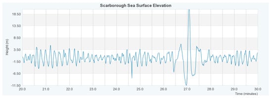 Ten-minute trace of 1.28 Hz data from the Scarborough wave buoy recorded on 13 January 2017 between 13:20 and 13:30UT. The spike between minutes 24 and 25 is the moment of shock to the accelerometers, leading to the apparent long and high wave artefact approximately 2 min after the initial shock.