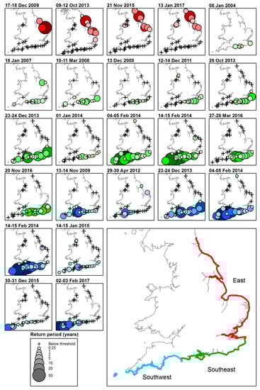 The analysis presented here is principally concerned with wave extremes as defined by significant wave height, but at Chesil (which is fully exposed to the Southwest), long period swell waves approaching exclusively from the Atlantic are of major significance for overtopping and coastal flooding [,]. Swell waves can advance much further east, reaching Pevensey Bay on occasion [], but in terms of the spatial impact of storm waves, Portland Bill typically marks the boundary between the eastern and western sections of the English Channel. Chesil, therefore, remains broadly within the Southwest region, in contrast to the nearby Weymouth Bay DWR, where the sheltering effect of Portland Bill restricts the storms to those affecting the whole Southeast area, together with the high magnitude 2013/2014 winter storms which impacted the entire Channel coast. However, the “special case” of Chesil is discussed further in Section 4.4 below.