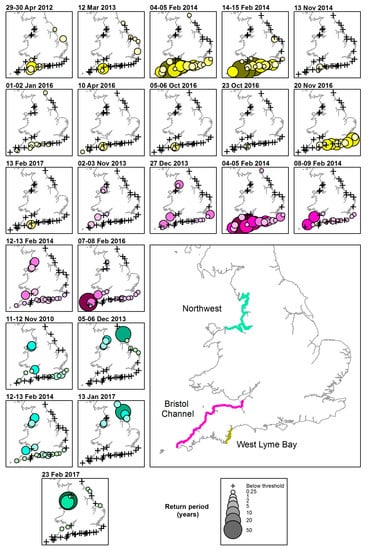 Spatial footprints of extreme wave events affecting at least two sites in the Bristol Channel and Northwest areas, and one site in West Lyme Bay.