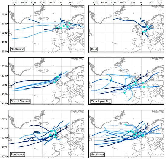 The tracks of those storms which had a significant spatial impact on the coastline, as defined by Figure 3 and Figure 4, were identified for each of the coastal regions (Figure 5). Storm tracks which affected the East coast region typically moved into the North Sea, broadly southwards into the southern North Sea or German Bight; one track (17–18 December 2009) moved southwest-wards along the coasts of the Low Countries. In contrast to storms affecting the southern and western coasts, however, those impacting the East coast were not always associated with deep depressions; rather, in half of the cases, the strong winds resulted from steep pressure gradients between shallow depressions (c. 1001 to 1010 hPa) in the southern and central North Sea, and intense anticyclones (c. 1034 to 1039 hPa) further north, over Norway or Iceland.