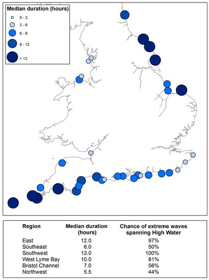 At a regional scale, the differential duration of extreme wave events is of particular importance for operational beach management, in light of the semi-diurnal tidal regime of the UK. The major operating concerns for high waves are twofold: firstly, the danger to life and property from wave overtopping and coastal flooding; and secondly, damage to sea defenses, where beach lowering in front of seawalls can lead to undermining of the foundations and subsequent damage or even collapse of the structure, as happened in Dawlish in 2014 [,] and at Folkestone in 2015. So, for beach operations, high waves are only of immediate concern if they span the period 1 or 2 h either side of High Water. Therefore, the 14-h median storm duration for the North Sea coast north of the Humber effectively means it is near certain that storm waves will coincide with the upper part of the tidal cycle at some stage, with a ~70% likelihood for the southern North Sea coast.