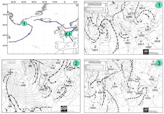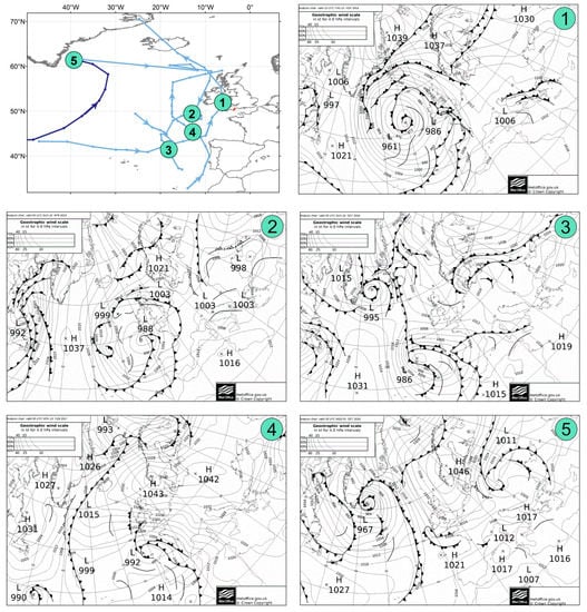 Storm tracks were digitized from the Met Office’s sea level pressure charts, based on the location of the center of low pressure, at six-hourly intervals.