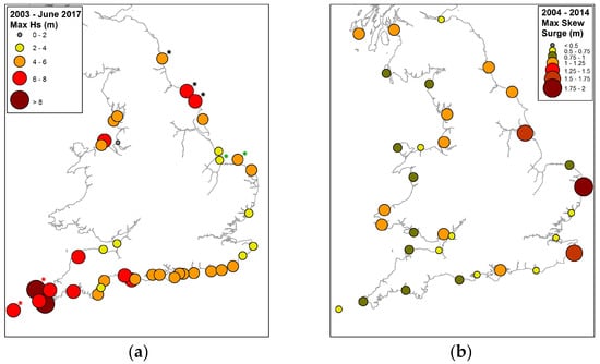 Maximum significant wave height measured by the wave buoy network (a) and maximum skew surge measured by the UK National Tide Gauge Network (b). The black asterisk indicates a buoy in ~15–20 m CD water depth, the green asterisk a buoy in ~2–30 m CD water depth, and the red asterisk a buoy in ~50 m CD water depth. All other buoys are in 1–15 m CD depth. Maximum skew surges were measured between 2004 and 2014, and were extracted from Haigh et al. [].