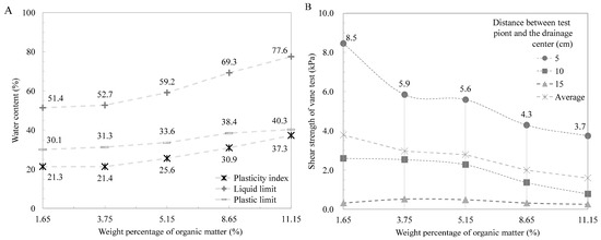 - It was demonstrated that organic matter plays a significant role in hindering the shear strength of consolidation. Organic matter affected the physical properties of the soil mainly through the adsorption of water on the surface of soil particles. Soil particles were connected to each other through the absorbed water film, leading to the decrease of resistance, adhesion strength, and the shear strength between soil particles.