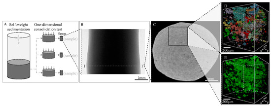 In the process of the vacuum preloading test, hydraulic mud samples were put in a vacuum-sealed box, in which it was difficult to continuously take soil samples. In order to have a better understanding of structure and mechanical mechanisms of organic matter during the soil consolidation, the fine-ground soil powder with measured organic content of 1.65% was passed through a 0.075 mm wet sieve to obtain organic matter and fine soil powder for the self-weight sedimentation and one-dimensional consolidation test under pressure. Samples were treated with vertical pressures of 0 kPa, 100 kPa, 200 kPa, 400 kPa, 800 kPa, and 1600 kPa. All samples were hand-cut into a size of 5 mm in diameter and divided into six columnar samples. In order to decrease the size effect of modeling [46] and to balance test conditions and image quality, the maximum thickness of samples was 66 times the maximum diameter (0.075 mm) of particles.