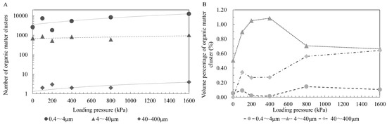 As shown in Figure 3A, the number of sub-macro organic clusters was few. Three scales of organic cluster (40–400 μm, 4–40 μm, and 0.4–4 μm) changed visibly in consolidation at 200 kPa and 800 kPa. As shown in Figure 3B, the micro scale of organic clusters was the main scale which had the greatest volume percentage. The volume percentages of three scales of organic cluster were changed rapidly at 100 kPa. When pressure was more than 400 kPa, the volume percentage of three scales of organic cluster was changed rapidly. Pressures of 100 kPa and 400 kPa could be two characteristic points of structure change of organic cluster, which perhaps matched the turning points of the destruction of hydraulic mud [49]. Therefore, it demonstrated that organic structure could be presented remarkably by volume percentage.