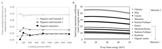 When pressure was from 100 to 1600 kPa, multi-component materials led to different correlation coefficients with the increase of pressure, as shown in Figure 4A. Because of the one-dimensional high-pressure consolidation test on soil samples without leaking out of particles with water, the change of correlation coefficient between two component groups with pressure was small. Meanwhile, the correlation coefficient between organic matter and pores was decreased with the increase of pressure, indicating that the coexistence between organic matter and pores was improved during the drainage consolidation. Meanwhile, the correlation coefficient between organic matter and Minerals 2 was positive at about 0.1, while the correlation coefficient between organic matter and Minerals 1 was negative at around −0.15. Although the weight percentage of organic matter was 1.5%, the correlation coefficients suggested that Minerals 2 might coexist with organic matter more easily than Minerals 1 because of its hydrophilic clay component.