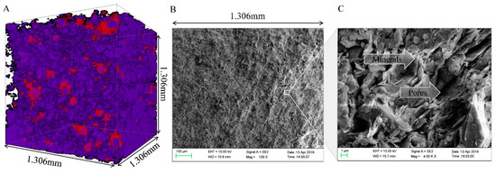 Minerals combined with pores. (A) Three-dimensional data-constrained modelling (DCM) model of clay mineral bound with pores (red denotes minerals, and purple indicates a mix of minerals and pores; (B) Amplified SEM image at 100 times magnification; (C) Amplified SEM image at 4000 times magnification).