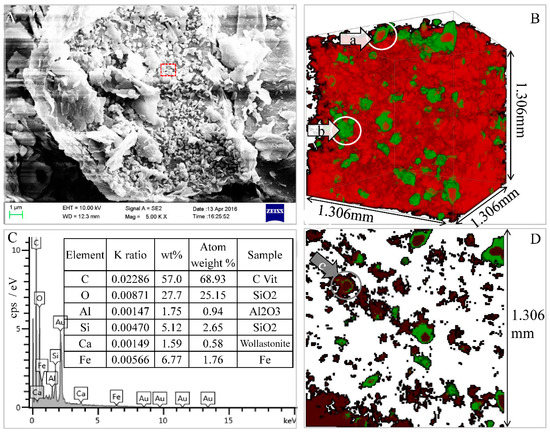 Chen (2005) reported that clay minerals could absorb pore water and closely coexist with organic matter. Based on SEM and Energy Dispersive Spectroscopy (EDX) results [51], the coexistence of organic matter (Figure 6A) and fine soil powder (Figure 6B) was obtained. It showed that there were aggregates or organoclay composite from organic matter (with large specific surface area) and mineral particles. According to the DCM, the 3D distribution of organic matter was similar to those of two minerals. For example, as shown in Figure 6C,D, the 3D coexistence of mineral with illite as its main component could be determined. There are three types in the coexistence of organic matter: organic matter is distributed on the surface of clay minerals, such as area “a” in Figure 6B; organic matter wraps clay minerals up, as in area “b” in Figure 6B; and organic matter is embedded in the layer structure of clay minerals, as in area “c” in Figure 6D. These states are surface adsorption, particle wrapping, and interlayer embedding, respectively.