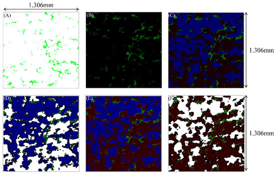 Multi-components distribution. Green, black, blue, red, and dark brown denote organic matter, pore, Minerals 1, Minerals 2, and a mixture of Minerals 1 and Minerals 2, respectively. (A) Two-dimensional slice of organic matter; (B) Distributions of organic matter and pore; (C) Distributions of organic matter, porosity, and minerals; (D) Distributions of organic matter and Minerals 1; (E) Distributions of organic matter, Minerals 1, and Minerals 2; (F) Distributions of organic matter and Minerals 2.