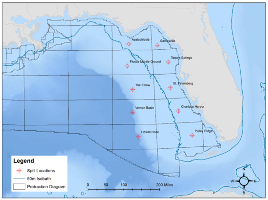 For the purposes of this research, a handful of locations were identified in the GOM, proximal to Florida, to simulate potential oil spills. Using the protraction diagram provided by the Bureau of Ocean Energy Management [59], ten locations were selected, ensuring geographic diversity and variety in offshore environmental conditions (Figure 1). Because the Florida shelf is so large (in terms of its extension into the GOM), seven of the selected spill locations fall within the area between the coastline and the 50 m isobath. Recall that this is the area without the presence of “squeezelines” and theoretically an area where very little particle movement will take place. The other four locations are in deeper waters and further from the Florida shoreline. It is important to acknowledge that locations off the Florida shelf tend to intersect the GOM loop current [60] for at least part of the year.
