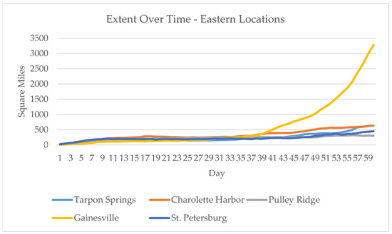 The model results show that spills beginning in the eastern locations were generally smaller in spatial extent than their western counterparts, with the exception of Gainesville, a clear outlier. At the end of the 60 day simulation period, the Gainesville spill has the largest spatial extent at 3272 square miles, followed by Tarpon Springs (616 sq. mi.), Charlotte Harbor (634), St. Petersburg (447 sq. mi.), and Pulley Ridge (304 sq. mi.) (Figure 2). Again, the lack of movement and geographic spread of these spills was somewhat expected given the minimal number of squeezelines in this area and lower east–west current velocity. In fact, for all locations except Gainesville, the plume remains relatively compact and moves slowly, in a northerly direction (Figure 3). In terms of plume dynamics, the lack of ocean current activity on the Florida shelf prevents the stretching and deformation of the plume as one typically sees further off shore (detailed in Section 4.2). At the end of the 60-day simulation, plumes are roughly 20 miles or more from the shore regardless of where the spill originated and none of the oil has reached the shores of Florida. However, as displayed in Figure 3, the plumes are on a northward trajectory toward the Florida panhandle.