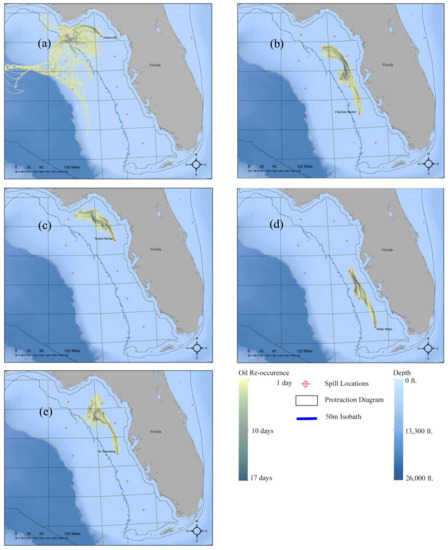 Eastern scenarios plume extent and shape over the course of the 60 day simulation period. (a) (top left) depicts the plume from the Gainesville scenario. (b) (top right) depicts the plume from Charlotte Harbor. (c) (middle left) depicts the Tarpon Springs plume. (d) (middle right) depicts the Pulley Ridge plume and (e) (bottom left) depicts the St. Petersburg plume. The plume is represented by the number of days that new oil particles moved through a specific location.