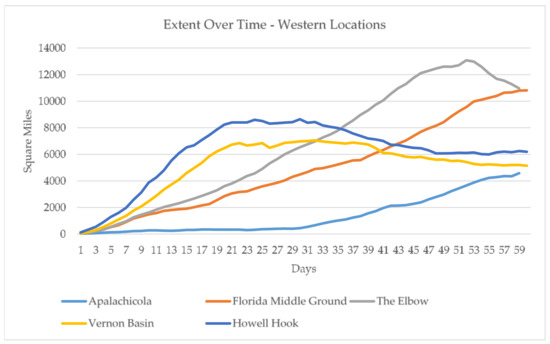 Plume extent as a function of time for the western locations.