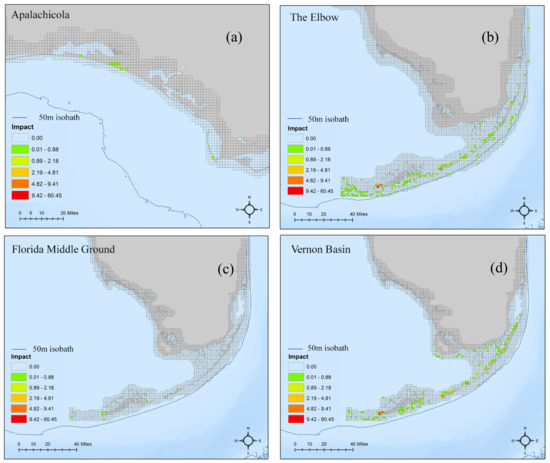 Spatial distribution of the impacts from the scenarios that had a coastal impact. (a) (top left) indicates the coastal impact from Apalachicola. (b) (top right) indicates coastal impacts from The Elbow. (c) (bottom left) indicates coastal impacts from Florida Middle Ground and (d) (bottom right) indicates the coastal impacts from Vernon Basin. With the exception of Apalachicola where the coastal impacts occurred on the Florida Panhandle, the majority of impacts were seen along the Florida Keys and Atlantic Coast of Florida.
