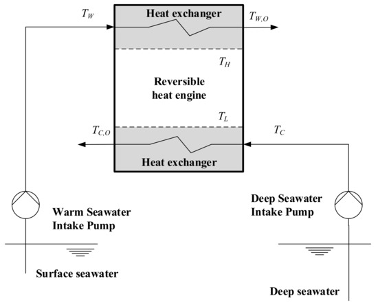 Figure 1 shows the OTEC power generation system model using a reversible heat engine. The ocean thermal energy is the temperature difference between the surface seawater and the deep seawater. To harvest the thermal energy, both seawaters should continuously flow to the heat exchangers in order to transfer the heat into the heat engine via the heat exchangers. The power output from the heat engine is W, the heat transfer rate of the warm seawater is QW and that of the cold deep seawater is QC, respectively: