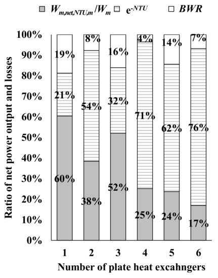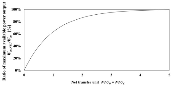 Figure 3 shows the relationship between the ratio of the maximum available power output Wm,NTU/Wm as a function of the net transfer unit in the case in which NTUW and NTUC are identical. According to Figure 3, the ratio of maximum available power will be 63%, 86%, and 95% when NTU is 1.0, 2.0, and 3.0, respectively.