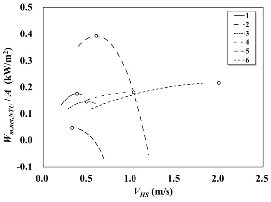 Figure 5 shows the net power output per heat transfer area as a function of the mean velocity of the heat source in the plate. In each PHE, the maximum power output per heat transfer area forms a parabolic path. The maximum power output is the balance of an increase in the maximum power and the heat source pumping power, since the overall heat transfer coefficient increases and the pressure drop increases with the mean velocity of the heat source, respectively. The overall heat transfer coefficient increases with the increase of the mean velocity of the heat source; however, the increase in the pressure drop is higher than the maximum power output. As a result, the net power output forms the parabolic curve. The range of the optimum heat source mean velocities is 0.33 to 2.00 m/s. In the case of Nos. 4, 5 and 6, the optimum heat source mean velocities are out of the range of the overall heat transfer coefficient experimental data or the pressure drop measurement data. However, the maximum points are computed using the approximated formulas, assuming that it is possible to extrapolate and to estimate the optimum points. As shown in Figure 5, a design at too high a mean velocity will cause a negative net power, which is shown in Figure 5 and also in [17,22].