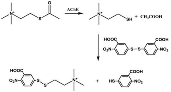 Chemical mechanism of Ellman’s method. The enzyme hydrolyzes the substrate ATCI to thiocholine and acetic acid. Thiocholine is allowed to react with DTNB, and this reaction resulted in the development of a yellow color [32].
