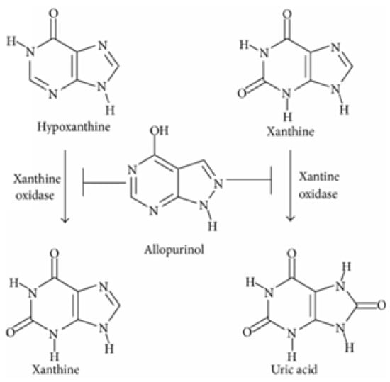 Inhibition of xanthine oxidase by allopurinol to prevent conversion of hypoxanthine to xanthine and/or uric acid [34].