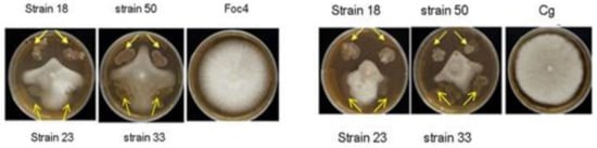 Plate confrontation method was used to screen the antagonistic bacteria as described by Feng [38]. PDA plates were inoculated with Foc4 or Cg, respectively, in the middle of the plates. Then, the bacterial strains were incubated 2 cm away from the pathogen using sterile toothpicks. Plates were incubated at 30 °C for 3 to 5 days. We determined the antagonism effect according to the zone of inhibition that was measured according to the method.