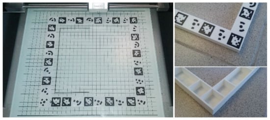 The quadrat is a homemade 3D printed plastic frame that can be easily made by anyone that has the 3D mesh file. This mesh file is designed to comply with the standard used by biologists. The frame’s internal dimensions were fixed to 200 × 200 mm. The external dimensions were chosen to ensure a good visibility of the targets: 230 × 270 × 15 mm. It incorporates two kinds of coded targets. First, 18 classical circular targets used by Photoscan and Photomodeler software—second, 18 square targets from the TagRuler system, which we have developed for our own photogrammetric platform ARPENTEUR [7]. The presence of these two kinds of targets enables processing the photos both in the commercial software and in our own photogrammetry modules. The 18 targets of each type are evenly distributed on the frame. Their location is precisely known and they can be used as control points. The shape of the quadrat itself, designed with CAD (Computer-Aided Design) techniques, takes into consideration underwater constraints; no air pockets, thickness of 2 mm and cellular framework to balance stiffness, weight and handling (see Figure 1).