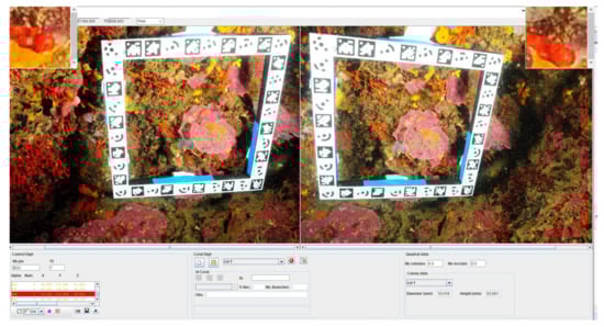 We developed a fully functional graphical user interface (see Figure 5) that enables us to perform measurements on the colonies inside the quadrat. The interface allows the presentation of two photos side by side (chosen by the operator from the set of photographs taken on-site and regarding these colonies). The user selects homologous points on the photos, so that the resulting 3D point is computed by triangulation. The interface performs real-time controls to ensure the integrity of the data, for example, correlation to ensure the quality of the chosen pair of points. Finally, the user has the possibility to determine various information including the diameter of the base, maximum height and approximate volume as well as visual observations, such as the percentage of necrosis for each colony and the density of colonies and recruits.