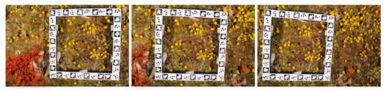 In practice, the printed quadrat is placed on the seabed (see Figure 2), or attached to buoys (embedded in the quadrat) on a cave ceiling or sometimes held in place by another diver (see Figure 3) who keeps it stationary with respect to the seabed. Then, between two and ten photographs are shot (but more generally, three are enough), so that the common covered area and the base are maximized (see Figure 4). Due to the difficult constraints of manned underwater acquisition (limited time, limited visibility, instability, etc.), this approach is easy to carry out and minimizes the number of photos and the processing time (see the next subsection).