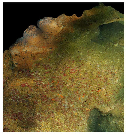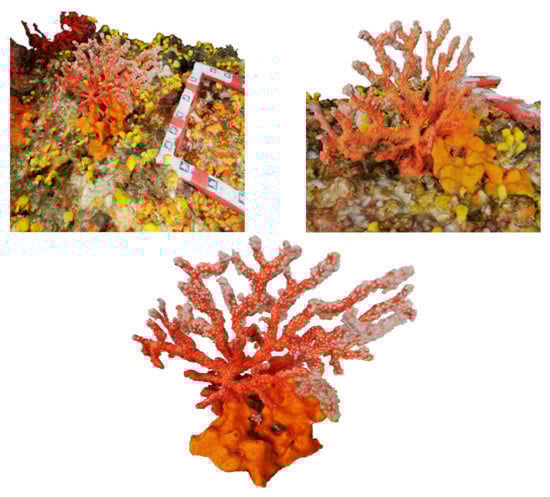 The classical photogrammetric approach is achieved by shooting hundreds of photos, with a high overlap. As said previously, the density of large colonies multiplies hidden areas. A photogrammetric acquisition relies on the redundancy of data, ensured by the redundancy of the areas’ shots. The more complex the colony, the more photos we should take and the less missing data we get in the reconstruction process. Moreover, red coral colonies grow in dark and narrow areas, like cave ceilings, which present a complex topography. This makes the photogrammetric acquisition process challenging and time-consuming. In a practical way, it is generally performed by a scuba diver. We tested both HD (Olympus TG2 and Canon G1) and reflex cameras (Nikon D700 and Nikon D300). The whole process enables computation of the 3D point cloud, and, next, the mesh based on the dense cloud. See examples of acquired large colonies in Figure 10 and Figure 11.