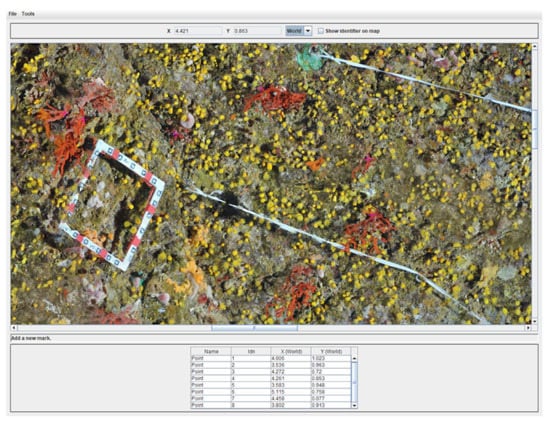 - The second kind of survey enables the tracking of temporal changes in red coral populations. It gives a fine scale spatial distribution of red coral populations. For these surveys, permanent plots were setup, which allowed for sampling the same areas through time. The plots were marked with PVC (PolyVinyl Chloride) or metal screws embedded in holes of the rocky substratum with epoxy putty. The total covered area varies between 1 and . That area is large enough to monitor hundreds of colonies over time. We used different DSLR cameras embedded in a housing and including two electronic strobes to photograph the transects (from Nikon D70 to D700). We implemented two different sampling methods. The first one consisted of setting a cord attached to the screws to define the plots in each sampling period. Quadrats with coded targets were then positioned above and below the cord as reference. At each position, a few photos were shot and a local coordinate system was defined. The second method consisted of obtaining orthophotos from the permanent plots. Since, in order to build orthophotos, moving a quadrat including coded targets is not possible, we use a global orientation of the scene and for studies at different times, we rely on the whole transect, which always remains fixed, to keep the same coordinate system and compare orthophotos. If biologists really need to sample individual colonies and visualize at the same time the standard of size defined by the quadrat (see Section 3.1), it is still possible to move a virtual 20 × 20 cm quadrat in the scene, using our dedicated application.