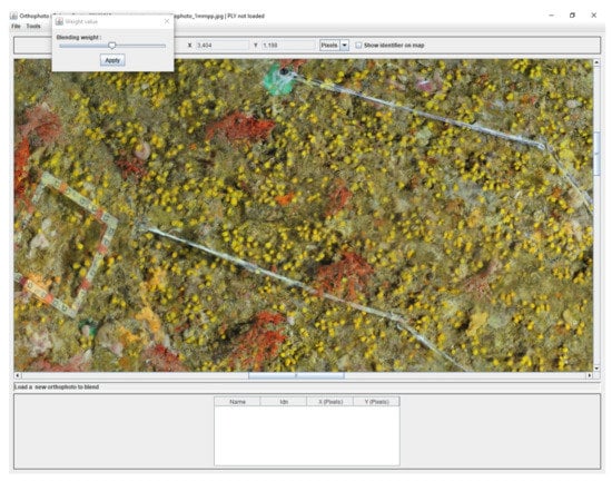 Another useful tool was developed to visualize the evolution of the populations over time. It takes advantage of the fact that transects remain in place for the photogrammetric studies at different times. Thus, the orthophotos can be oriented in the same coordinate system. An example is provided in Figure 9. Moreover, the weighting value to blend the two images can be changed on the fly.