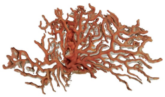 Red coral (Corallium rubrum [1]) is considered an emblematic species for the Mediterranean Sea [2]. Red coral is an invertebrate that grows forming arborescent colonies in rocky habitats from 10 to 800 m in depth (Costantini [3]). With a lifetime of up to 100 years, this species displays a slow growth rate (<1 mm in height per year) with a recorded maximum size up to 50 cm in height [4,5]. Red coral has been fished in the Mediterranean since antiquity for its use in jewelry. As a result of this secular fishing, the current population is characterized by colonies that rarely reach more than 10 cm in height, except in protected areas or in deep water where an unexploited population can still be found.