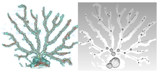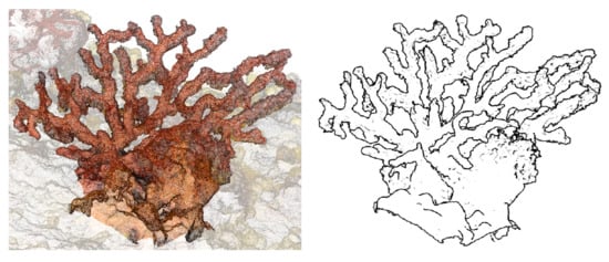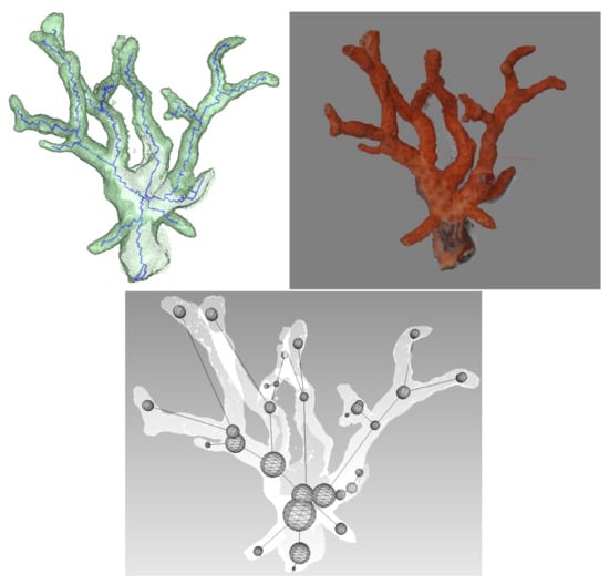 - The third type survey implemented was designed for the characterization of emblematic large colonies that have a high natural heritage value (last goal of the paper). The complex shape exhibited by large colonies as well as the entanglement of the branches lead to several problems. Likewise, the proximity of the substrate on which the colony is attached may disturb the analysis. The survey is designed to acquire and build a 3D model first in several ways and then perform automatic measurements on the colonies and determine relevant quantitative morphological information (e.g., like the number of branches). Non-photorealistic rendering based post-processing to smooth the shape, as well as skeletonization methods, were developed.