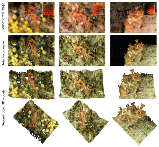 Our goal is to make this approach work in the marine environment so that only one shot is enough to obtain a properly scaled 3D model, which is a great advantage underwater, where diving time and battery capacity are limited. The procedure to work with a plenoptic camera is described in the following. Figure 18 shows examples plenoptic underwater images and reconstructed 3D models.