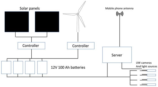 The unit was powered by four batteries (Haze Gelled Electrolyte range model HZY 12-100, 12 V, 200 Ah). The batteries were charged by a windmill (Rutland 1200, 500 watts, diameter 1200 cm, producing 500 W at 15 m/s) placed on the pontoon on a 4 m long metal stick connected to a controller (Marlec, Corby, UK, Hybrid MPPT Charge Controller) and by two solar cells (Monocrystalline Solar Module JT195 Ab, 380 W, 1550 × 808 × 40 mm. Jetion Solar Europe, Ruggel, Liechtenstein) connected to a controller (Steca PR 3030. RS Components, Copenhagen, Denmark) (Figure 4).