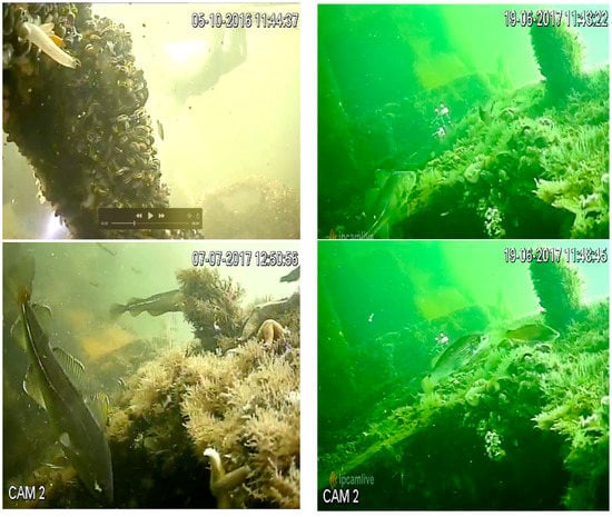 The quality of the video footage was very satisfactory also when used on large screens with projectors when teaching at schools; it allowed for a resolution down to a few mm. Large amounts of invertebrates of sizes from less than a cm to above 10 cm could be classified as well as a great variety of fish and shrimp of approximately 1–30 cm length passing by the cameras (Figure 7). The screen shots from the live cameras taken in October 2016 show a diver in the background and different animals in front, dominated by blue mussels (Mytilus edulis) and sea squirts (Ciona intestinalis). The three screenshots from June 2017 and July 2017 show a large variety of species including cod (Gadus morhua) and goldsinny wrasse (Ctenolabrus rupestris) observed in large numbers at the wreck.