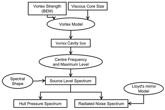 The present paper proposes a semi-empirical method to predict the broadband hull pressure fluctuations and URN by propeller tip vortex cavitation that can easily be used in the propeller design process. The method is based on the semi-empirical method to predict on board noise of cavitating tip vortices by Raestad [21]. This method relates the noise to the size of the vortex cavity that is estimated from a potential flow method. In the present method, use is made of the boundary element method (BEM) PROCAL [14,23,24] to estimate the vortex strength (circulation) of the tip vortex. This strength is used in a vortex model for the radial distribution of the azimuthal velocity to predict the cavity size for a given cavitation number. The vortex model and cavity size prediction are discussed in Section 2.1 and Section 2.2, respectively. The predicted cavity size has been used in an empirical relation for the centre frequency and maximum level of the broadband hump. This procedure is presented in Section 2.3. A flow chart of the method is shown in Figure 1. The spectral shape of the source level spectrum and conversion to hull pressure spectrum and URN spectrum is presented in Section 3. Comparison of predicted and measured spectra is presented in Section 4. The results of the method are discussed in Section 5.