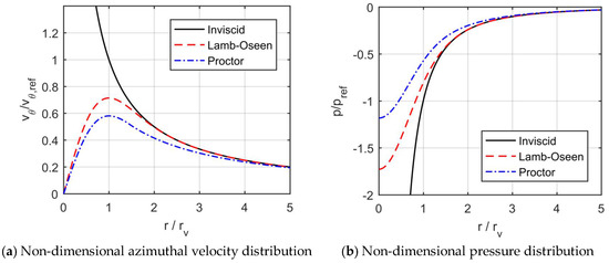 In this formulation, is the length scale related to the vorticity roll-up region, taken as the wingspan of the aircraft by Proctor. The parameters and are non-dimensional empirical parameters, which take the values and . The variation of the azimuthal velocity with radius is presented in Figure 2a and the corresponding pressure distribution is presented in Figure 2b. The parameter was taken as