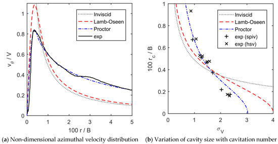 with the static pressure at the location of the wing, the vapour pressure and the free-stream velocity of the cavitation tunnel. The cavity size was obtained from image analysis using high speed video (hsv). The wing was of elliptical planform (half-span ) and tested at three angles of attack. The velocities were averaged in the circumferential direction and the resulting azimuthal velocity distribution for 7 deg angle of attack is presented in Figure 3a, which also shows the results of the vortex models. In these models, was taken as the radius at which the measured has the maximum value. The Proctor vortex is capable of describing the measured velocity distribution very well after adjusting the coefficients for and . The strength for the Proctor vortex was set to 80% of the maximum value of the spanwise circulation distribution on the wing. This maximum value can be computed from the measured lift coefficient assuming that the circulation distribution is given by the analytical formulation. The resulting variation of with of the Proctor vortex also shows very good agreement with experimental data, as shown in Figure 3b. The inviscid and Lamb–Oseen vortex do not describe the velocity distribution and the cavity size variation well. In the results shown, the vortex strength for these vortices has been adapted such that the average cavity size is well predicted. It is remarked that the good prediction of the variation of cavity size with cavitation number by a vortex model for non-cavitating flow is not understood from a physical point of view. Experiments for cavitating flow suggest that the viscous core size used in the vortex model changes in the presence of cavitation, which results in a different prediction of the cavity size [26].