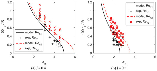 with the chord length and the Reynolds number for the chord length and the resultant velocity at 0.95R. The value for parameter is computed using the formulation by Shen et al. [33] resulting in a value of 0.38 and 0.37 for the lower and higher Reynolds number, respectively. The effect of the change in Reynolds number on cavity size is well predicted by this method. The vortex model shows that the effect of the viscous core size on the cavity size decreases with increasing cavity size, as shown in Figure 4a.
