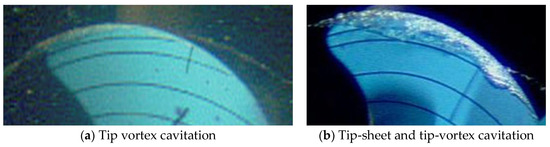 During the process of determining the empirical constants, it became apparent that the experimental datasets had to be divided in separate groups. A distinction was made between cases for which tip-vortex cavitation was dominant and cases for which, close to the tip, sheet cavitation was also present. Figure 6 shows examples of these two situations. This behaviour was also expected in the fit of the cavity size for the propeller tip vortex cavitation as discussed in Section 2.2.