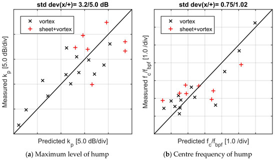 The accuracy of the fit for the maximum level of the hump and for the centre frequency for the two groups is presented in Figure 7a,b, respectively. An example of the fit of the noise level for an individual data set, not included in Figure 7, is presented in Figure 8. The propeller is a two-bladed research propeller with skew and tip-unloading tested for a range of cavitation numbers and thrust coefficients [3]. The cavitation pattern on this propeller is a cavitating vortex structure that is generated on the leading edge.