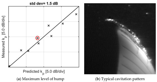 Comparison between measured and predicted maximum level of the hump for a two-bladed research propeller tested at various advance ratios and cavitation numbers. The cavitation pattern corresponding to the encircled symbol is shown on the right.
