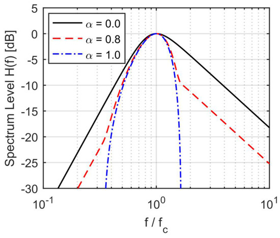 in which corresponds to the slope for high frequency, with typical value , and corresponds to the slope for low frequency, for which a value is used as suggested in [35]. For different values of and , the maximum value of is different from 0 dB, which needs to be corrected for.
