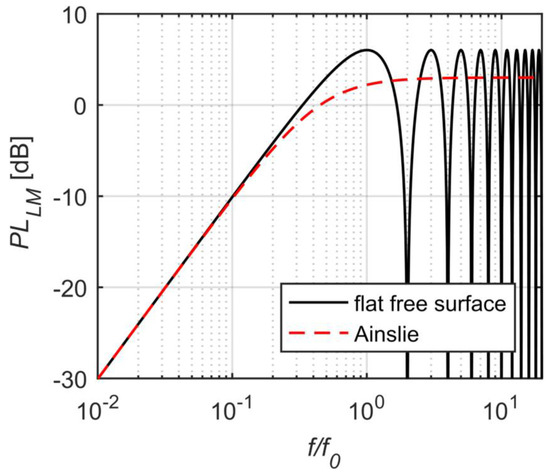 where corresponds to the acoustic wave number, with the speed of sound, to the submergence depth of the cavity collapse and to the hydrophone depression angle. The function is compared in Figure 10 to the theoretical formulation of the Lloyd’s mirror effect for a flat free surface [39]. The frequency in Figure 10 is made non-dimensional with the critical frequency ,