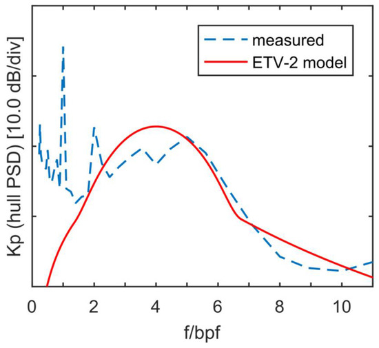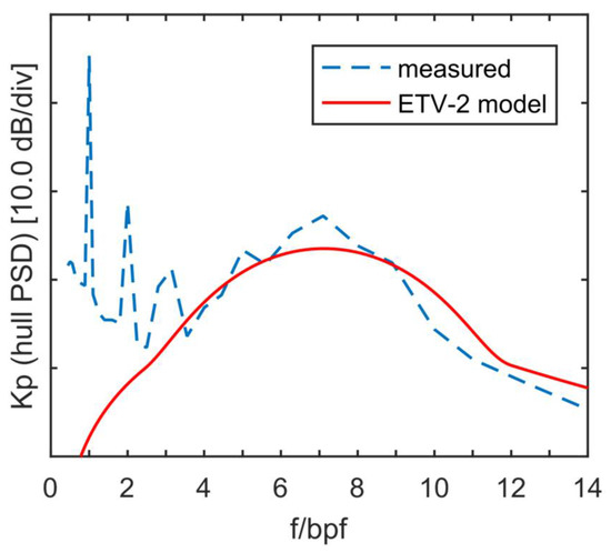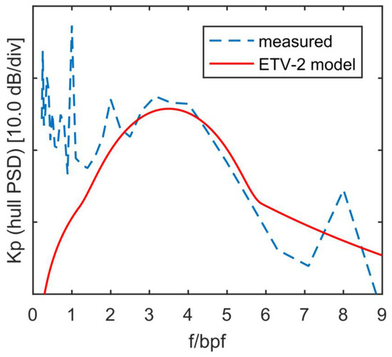 An example of the resulting spectrum of hull pressures predicted by the ETV model for the two-bladed research propeller is presented in Figure 11. Overall, the hump is well represented by the default spectral shape. The values of the empirical parameters for the maximum level and centre frequency were obtained from a dedicated fit to the test series for this propeller. The comparison between the resulting predicted and measured levels is given in Figure 8.