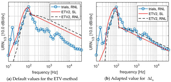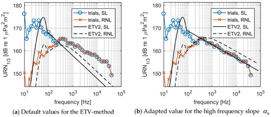 Results with default values are presented in Figure 16a. The maximum level is very well predicted, but the measured values in that frequency region are reported to be mainly due to machinery noise. At high frequencies, the agreement is not as good because the assumed slope of the spectrum is smaller than in the experiments. Adjustment of the high frequency slope to gives good agreement (see Figure 16b).