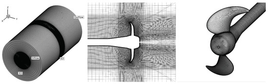 Since open water conditions are considered, the computations can be done using a body fitted, rotating reference system. For this, the propeller has been modelled in a rotating circular domain with diameter and length three and five times the propeller diameter, respectively. The propeller is located in the middle of this domain. The computational domain consists of a structured multi-block grid built with GridPro, using a standard block topology developed at MARIN. The topology is applied quite often and gives good quality grids, most of the time. However, for the propeller considered here, grid generation was cumbersome due to the relatively high skew of the propeller blades, the relatively thin leading edge and propeller section thickness’s. The quality of the grid was not very high, which leads to convergence problems of the solver when using higher order discretisations of the convective fluxes (QUICK scheme). Therefore, for all calculations, a blending between central and upwind discretisation was used. Figures of the domain, grid and propeller are depicted in Figure 1. For all the calculations, the turbulence model has been used as described in [28]. The turbulence model gives very similar results as the SST model, but shows in general an improved iterative convergence. This has been shown explicitly for propeller flows [29].